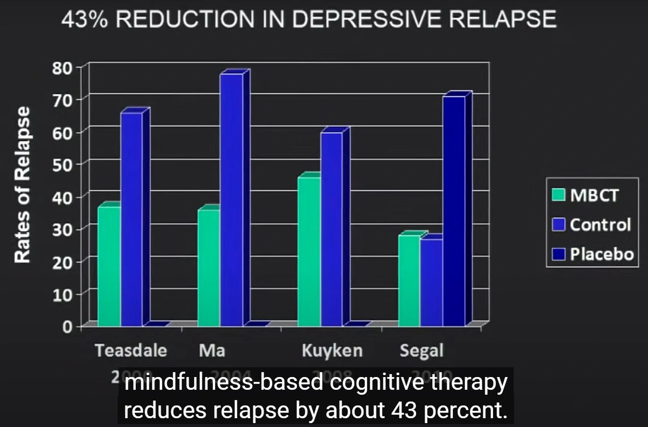 - Klinické studie prokázaly velmi vysokou účinnost MBCT: u pacientů s depresí poklesl relaps o 45 %, což odpovídá účinkům dlouhodobého užívání antidepresiv.