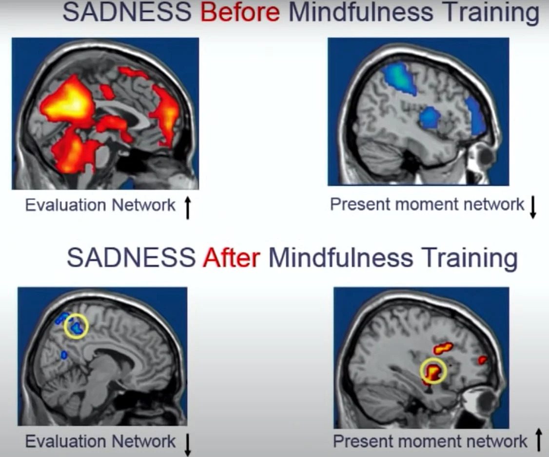 - Při praktikování mindfulness byly zjištěny změny v mozkové kůže, které jsou spojené s prožíváním přítomných vjemů namísto jejich konceptuálního hodnocení. Zejména dochází k aktivaci insulárního kortexu.